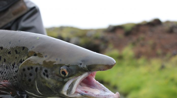 Skarfurinn ókyrrðist þegar Pétur þokaði sér nær og Pétri var nokkuð brugðið þegar fyglið tók að kippast til og leika allt á reiðiskjálfi. Brátt kom í ljós vænn laxasporður út um kjaftinn á skarfinu og smátt og smátt allur laxinn og fyrr en varði var hann búinn að æla laxi sem sannarlega var enginn tittur, líklega 6-7 punda fiskur, í heilu lagi. Hann hafði greinilega sporðrennt laxinum með hausinn á undan, enda rennur hann eflaust betur niður þannig, en þó hann væri frekar snöggur að æla fiskinum á ný var það ekkert áhlaupaverk. Eins og sjá má af myndunum þá var laxinn það heillegur að skarfurinn var augljóslega tiltölulega nýbúinn að gleypa laxinn. Er magnað að sjá á meðfygljandi myndum hversu gífurlega skarfurinn getur þanið bæði kjaft og háls.