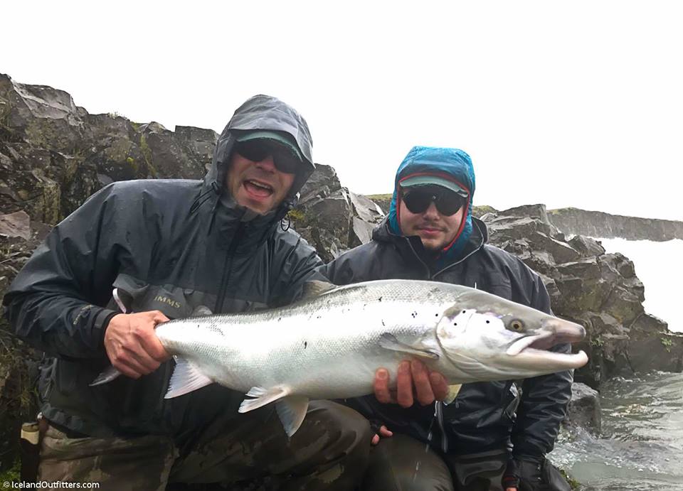 En það kom ekki að sök, þeir voru snöggir að setja í fyrsta laxinn og var það þar með fyrsti flugulax sumarins, því að þeir feðgarnir Haukur H. Ómarsson og Hrafn H. Hauksson byrjuðu daginn með flugu. Þetta var glæsilegur hængur eins og myndin ber með sér og tók hann flugu að nafni Franc N Snælda, sem gæti gefið til kynna að um afbrigði af Snældu sé að ræða. Flugu þessa hannaði Sean Stanton.