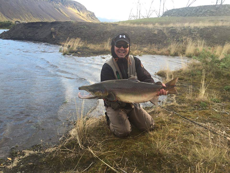 „Fyrir vikið er best að veiða þarna síðsumars og á haustin,“ segir Guðmundur Atli og heldur áfram að segja frá veiðistöðum. „Neðan við Hjálparfoss má segja að sé samfelldur veiðistaður frá djúpa pottinum neðan við fossinn og niður á brot. Einna heitast er frá því þar sem lítill lækur kemur útí að austanverðu og niður fyrir steina sem þar eru úti. Þarna er yfirleitt gott hlutfall af stórlaxi og síðasta sumar þreytti ég einn drjúga stund með tvíhendu og sterkum tólum í góðar tuttugu mínútur áður en hann slapp. Allan þann tíma bara lá hann óhagganlegur. Sýndi sig aldrei. Ég geri ráð fyrir að það hafi verulega vænn lax.