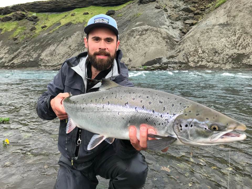 Þröstur Elliðason með einn af fyrstu löxunum úr Jöklu í morgun, 83 cm hrygnu! Myndin er frá Strengjum.
