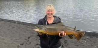 Sjóbleikjan er að ganga í Fögruhlíðarósinn, þessi er hátt í 60 sentimetrana…myndin er frá Strengjum.