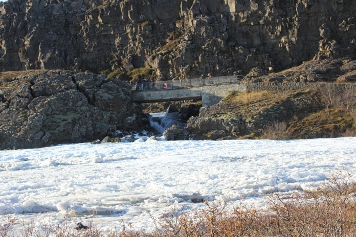 En miðað við myndirnar, þá hefur frostið verið umtalsvert. Klaki hrannast upp og hvergi auðan blett að sjá, nema við brúna neðst. Undir ískápunni fá þeir frið til að fjölda sér í friði.