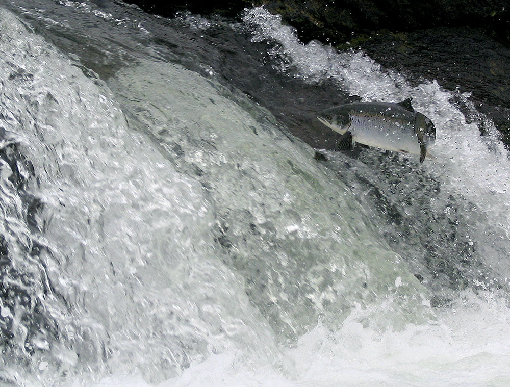 Smálax lætur vaða í Fossinn í Elliðaánum. Ath að myndin er ekki ný. Mynd Heimir Óskarsson.
