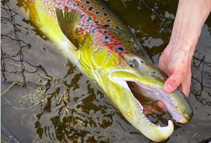 Hængtröllið á myndinni „eitthvað yfir meterinn,“ að sögn Haraldar Eiríkssonar leigutaka Laxár í Kjós og Bugðu, en laxinn veiddist í Bugðu, í Bakkahyl, á lokamínútum lokadagsins. „Hann fór ekki hátt þessi, en hér er á ferðinni einn af stærstu löxunum sem veiddust á Vesturlandi þetta árið. Mjög líklega dvaldi laxinn í Meðalfellsvatni lungan úr sumrinu, en sakkaði sér niður í Bakkahyl, einn af efstu veiðistöðum árinnar til hrygningar,“ bætti Haraldur við. Hann sagði Aron Sigurþórsson á Meðalfelli hafa sett í og landað laxinum, en vissi ekki hvaða flugu tröllið tók.