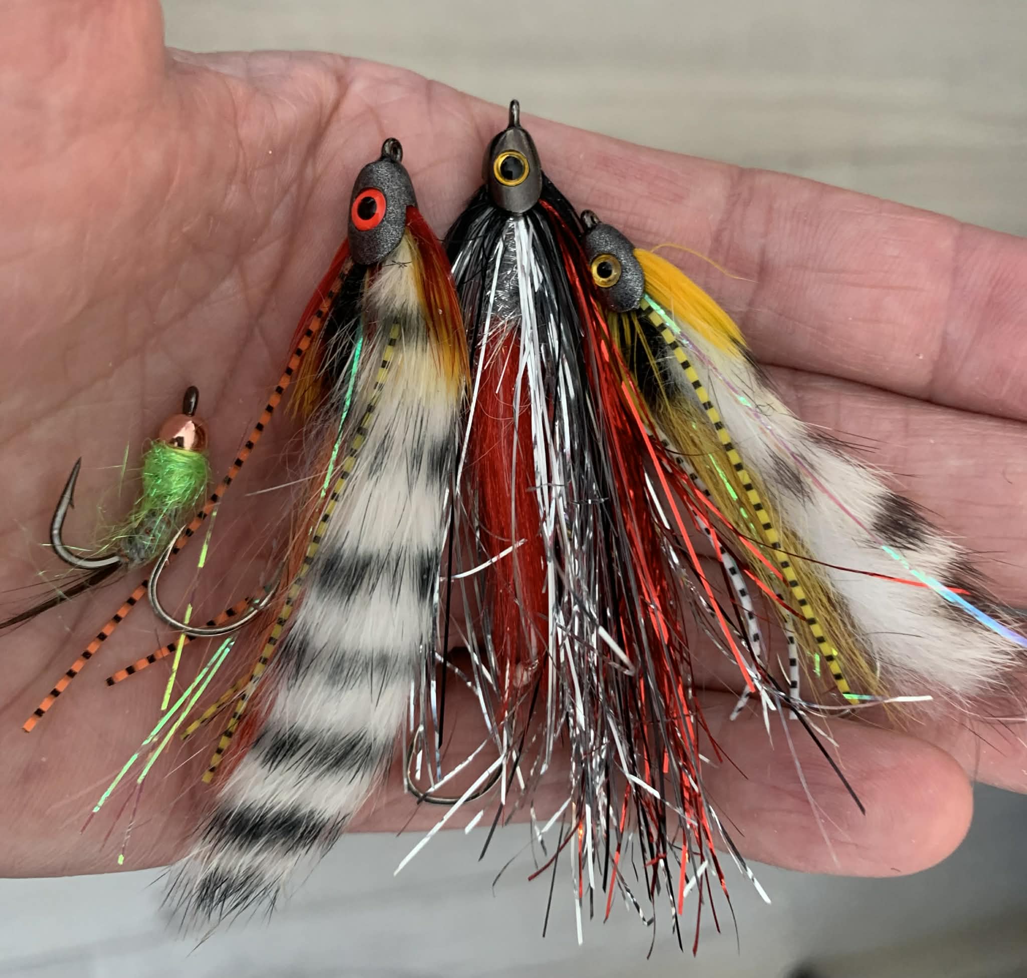Svo kom hér þrjár sem að Jón Ingi í Vesturröst lét okkur hafa í október í fyrra. Leiðin lá þá í Heiðardal, Vatnsá og Heiðarvatn. Í brjáluðu slagveðri virkuðu þessar einkar vel og engin ástæða til að ætla að þær virki ekki vel á urriðann að vori. Tvær í lófanum eru glimmer og gúmmílappa afbrigði af svarta draugnum. Þessi á kantinum er kanski fulltrúi pupnanna sem virka líka vel. Þetta er Green Dumm, hnýtt af Reiðu Öndinni og hefur verið óhemju öflug vor og haust. Þessi litríka í miðjunni er hins vegar eitthvað annað.Löng, glimmeruð…hún gaf tvo 83 cm birtinga í Vatnsá s.l. haust og fleiri smærri í vatninu. Jón Ingi vissi ekki nafn á henni, en ég kalla hana Jingi.