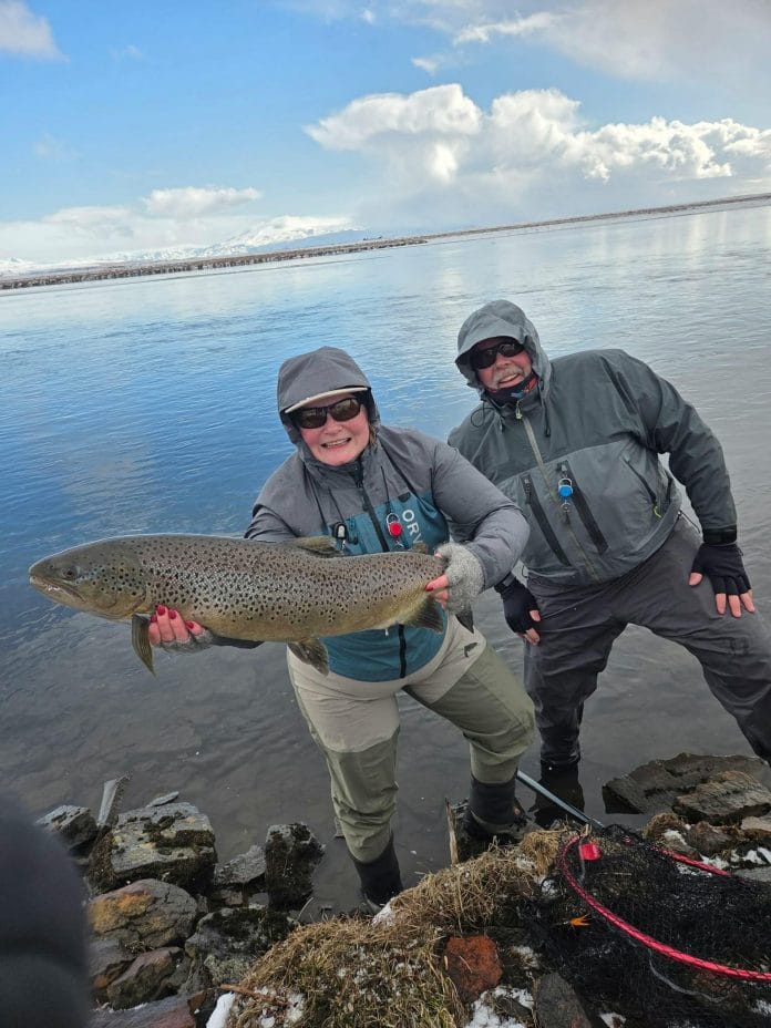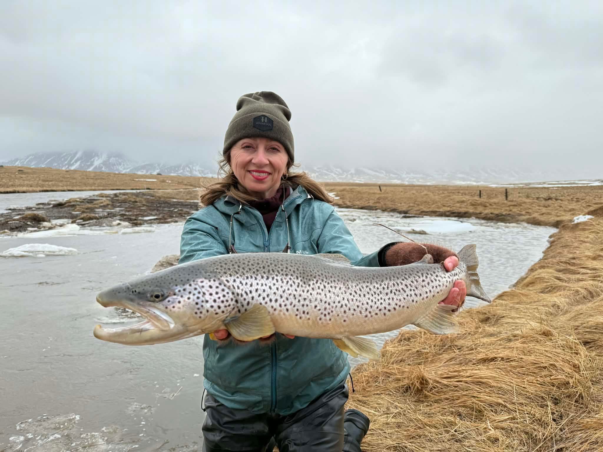 Þetta mátti sjá á heimasíðu IO Veiðileyfa í dag, Harpa Hlín, einn eigenda IO með svakalegt tröll. Margir rosalega vænir í þessari litlu sprænu. Þar verður veisla næstu daga, því að það á ekki að kólna aftur í bráð. Þá eru Laugardælirnir hennar Kollu í Veiðibúð Suðurlands ekki á förum og bíða veiðimanna. Fregnir af þeim stærsta í vor komu frá Ytri Rangá, birtingur upp á 95 cm og 45 cm í þvermál. Sama dag, annar 80 cm.
